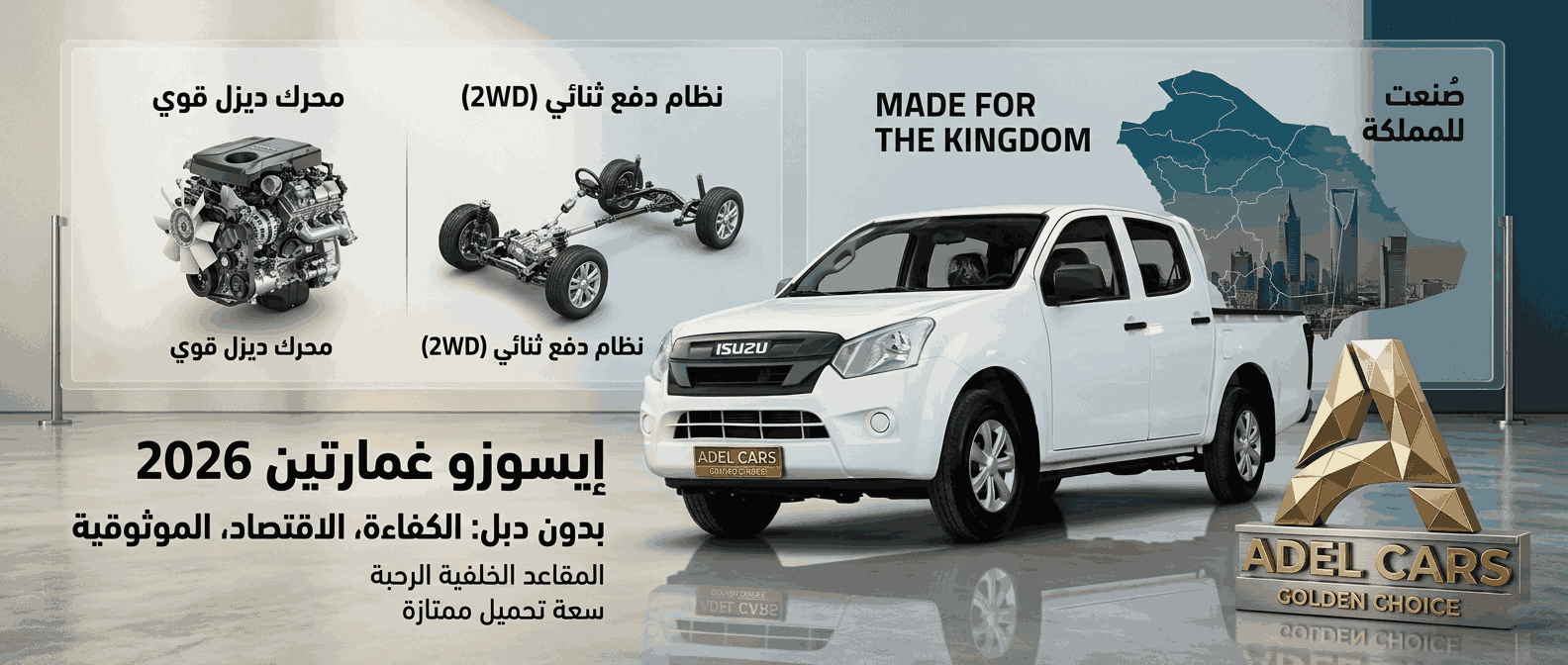 إيسوزو ديزل غمارتين: شريكك الأقوى في العمل تجمع إيسوزو غمارتين بين قوة محركات الديزل واعتمادية التحمل، مما يجعلها الخيار الأول للمهام الشاقة والأعمال التجارية في المملكة. بفضل كفاءتها العالية ومساحتها الرحبة، تضمن لك إنجاز مهامك بأقل التكاليف وأعلى مستوى من الأداء. احصل عليها اليوم من عادل للسيارات.